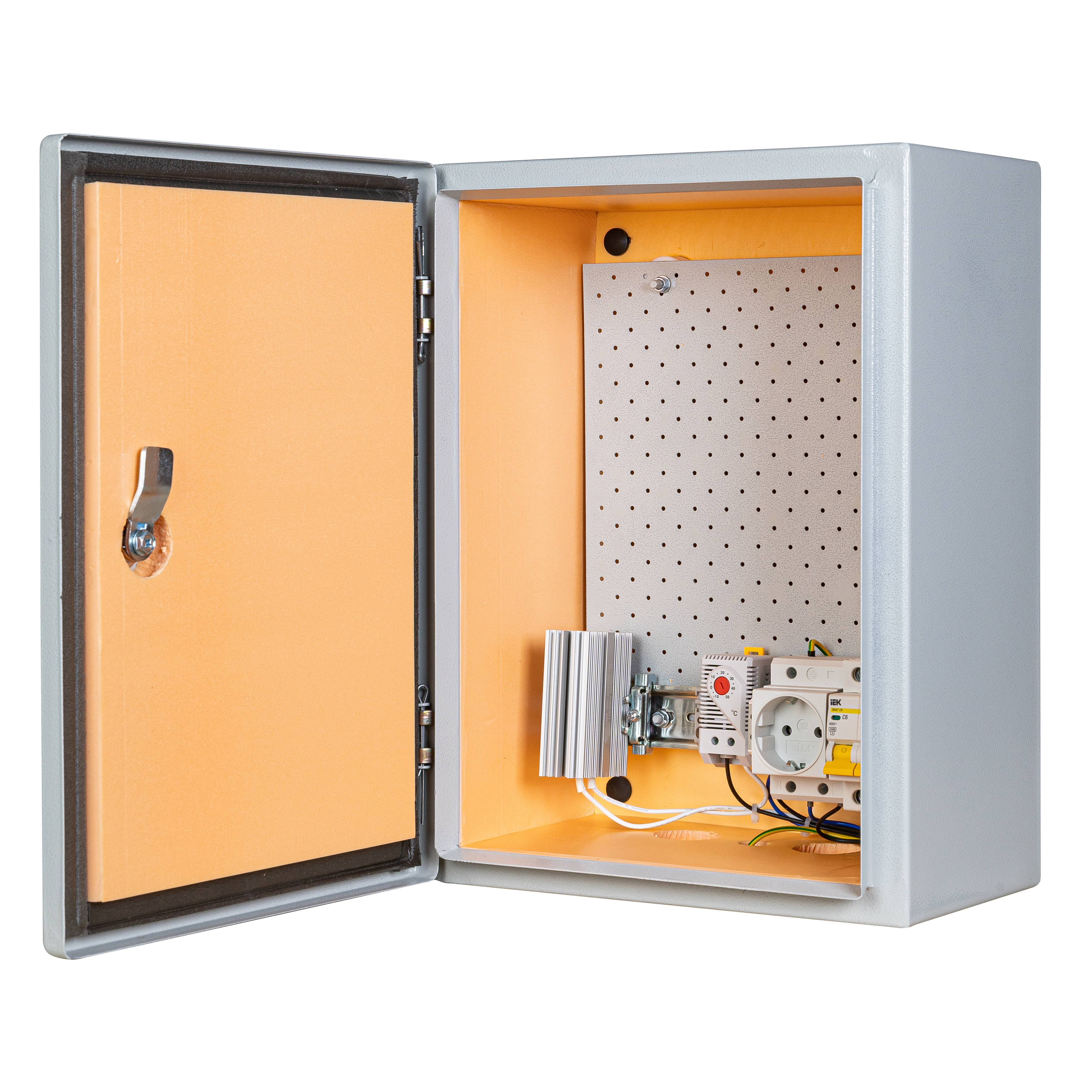 утеплитель из пенополистирола, замок 1 шт,ключ 1 шт, монтажная плата 1шт, гермовводы 2шт, розетка 1 шт, автоматический выключатель 1шт, термореле 1шт, нагреватель мощностью в 30 Вт 1шт.