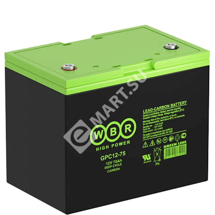 Аккумулятор WBR GPC12-75 - герметизированная, карбоновая, свинцово кислотная, аккумуляторная батарея со сроком службы 15 лет или более 1900 расчетных циклов заряда-разряда в циклическом режиме при 70% разряде. Эта высокоэффективная, перезаряжаемая батарея не требует обслуживания в течение всего срока службы и за счет использования чистого свинца, а также добавки углерода в состав электродов получили улучшенные зарядные и разрядные характеристики.