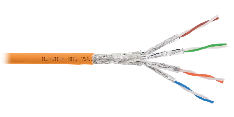 Кабель NIKOMAX S/FTP 4 пары, Кат.8 (Класс I), тест по ISO/IEC, 2000МГц, одножильный, BC (чистая медь), 22AWG (0,62мм), полимерный материал нг(А)-HF, внутренний, оранжевый, 500м - гарантия: 15 лет /25 лет системная