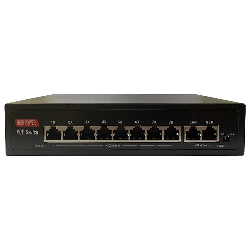HN-POE208 V2 – неуправляемый коммутатор на 10 портов, 8 из которых с поддержкой технологии POE стандарта 802.3af/at (Type A) 100Мбит. Максимально поддерживаемая мощность подключаемых устройств составляет 30Вт на порт. Дополнительно присутствуют 2 порта с максимальной скоростью до 100Мбит: один для подключения видеорегистратора или другого видеозаписывающего устройства, другой для подключения к сети интернет-провайдера. Данный комутатор может работать в режиме IPC, который позволяет передавать данные без питания по PoE на расстояние до 250 метров на скорости до 10 Мбит/с. Максимальная суммарная нагрузка на POE составляет 135 Вт
